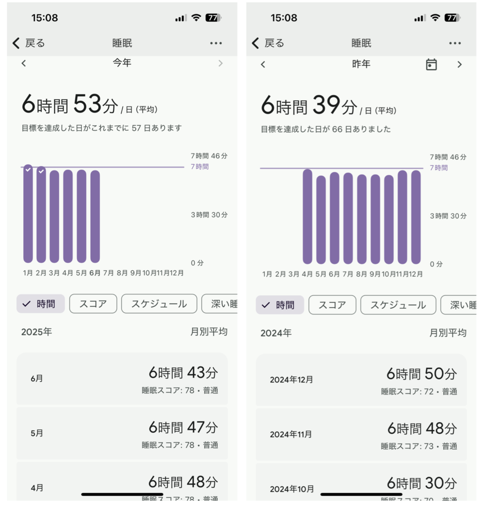 ここ最近は、目標を7時間/日に設定していますが、少し届かず、ここ半年の平均は6時間53分でした。昨年の平均は6時間39分で、昨年比では、少し睡眠時間が増加です。