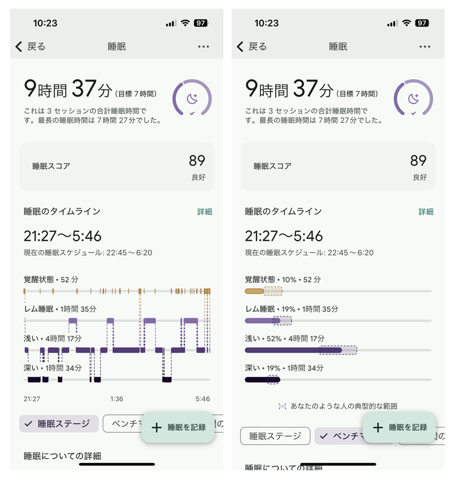 一番下の「深い」眠りは過去から平均値よりも多く、ぐっすり寝ているのだと思います。一方で回復を促す睡眠の「レム睡眠」は、過去は平均よりも少ないことが多いのですが、最近は増えてきました。
